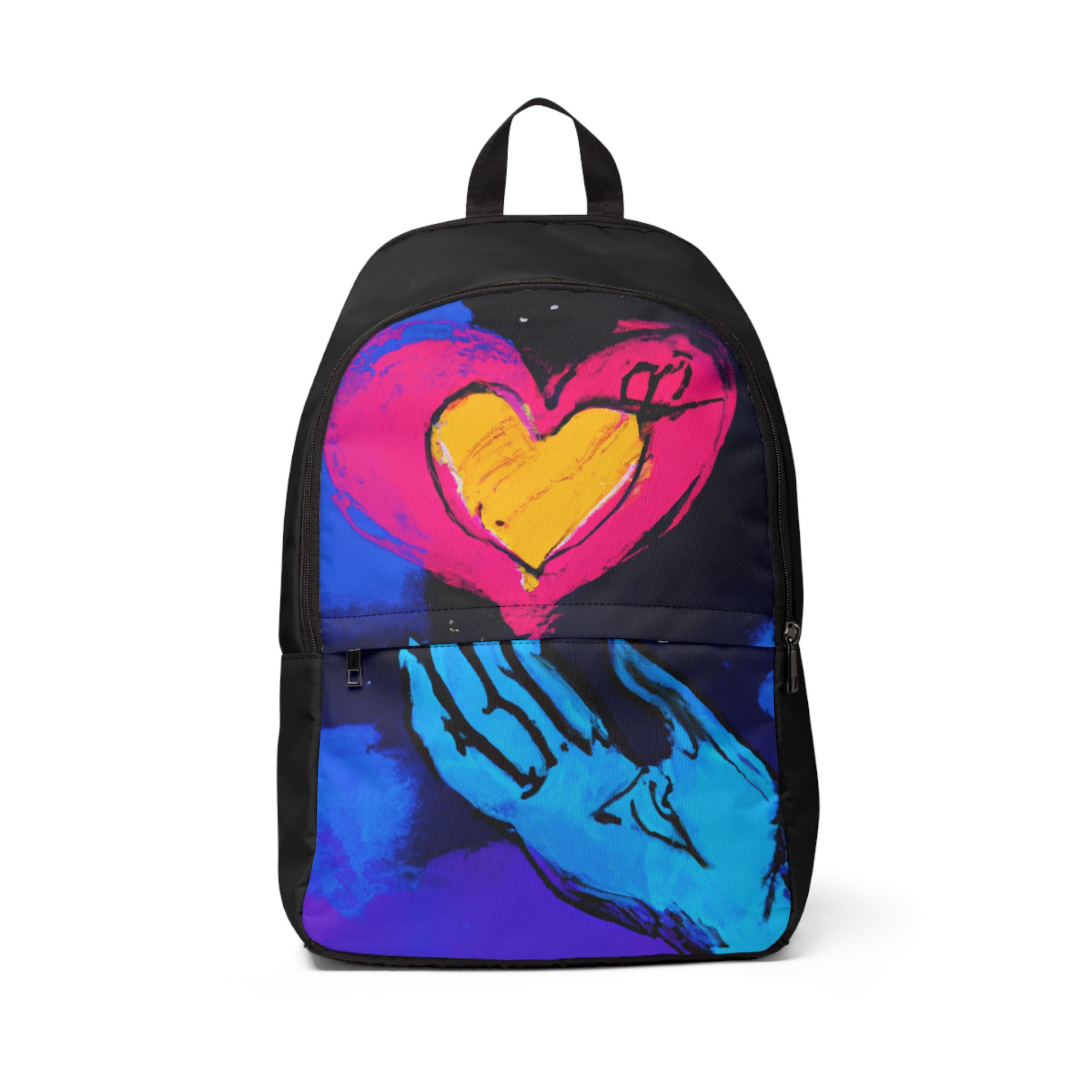 • – **Original Artwork:** Showcasing a captivating design of a blue hand reaching for a colorful heart in space, this backpack is a statement piece that stands out.